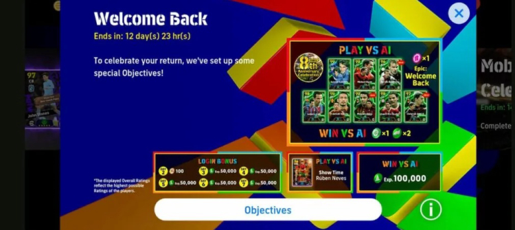 Это ограниченное по времени событие призвано отметить вернувшихся игроков и дать им возможность быстро укрепить свой состав. Хотя Konami официально не сообщила, что именно считается "вернувшимся игроком", те, кто соответствует скрытым критериям, автоматически включаются в двухнедельную кампанию при входе в игру.